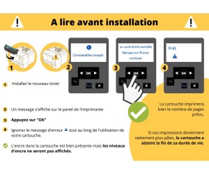 Ce consommable est livré avec la puce d’origine constructeur alors que les autres consommables compatibles existants sur le marché ne sont pas équipés d’une puce ce qui vous oblige à confirmer manuellement chaque impression.